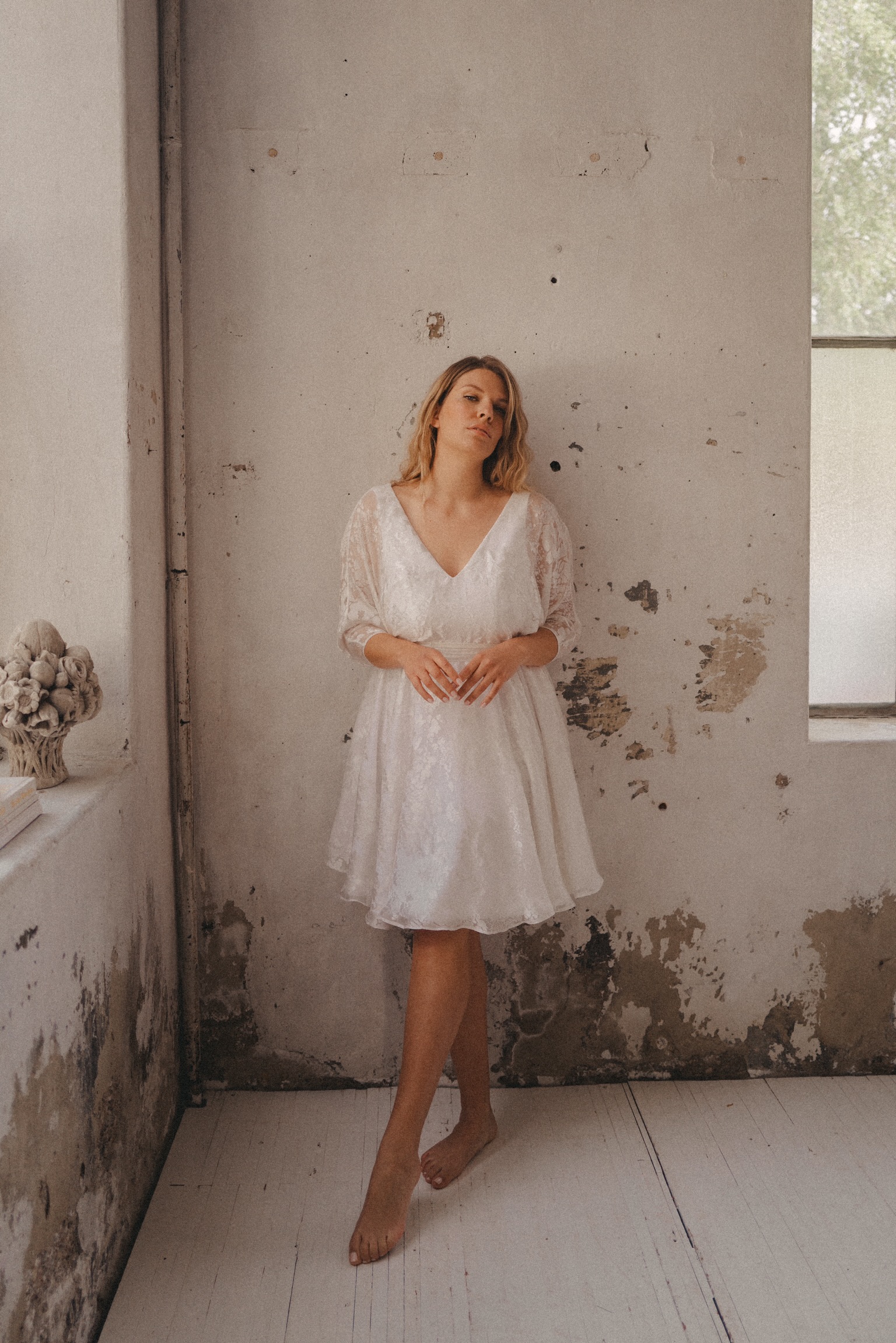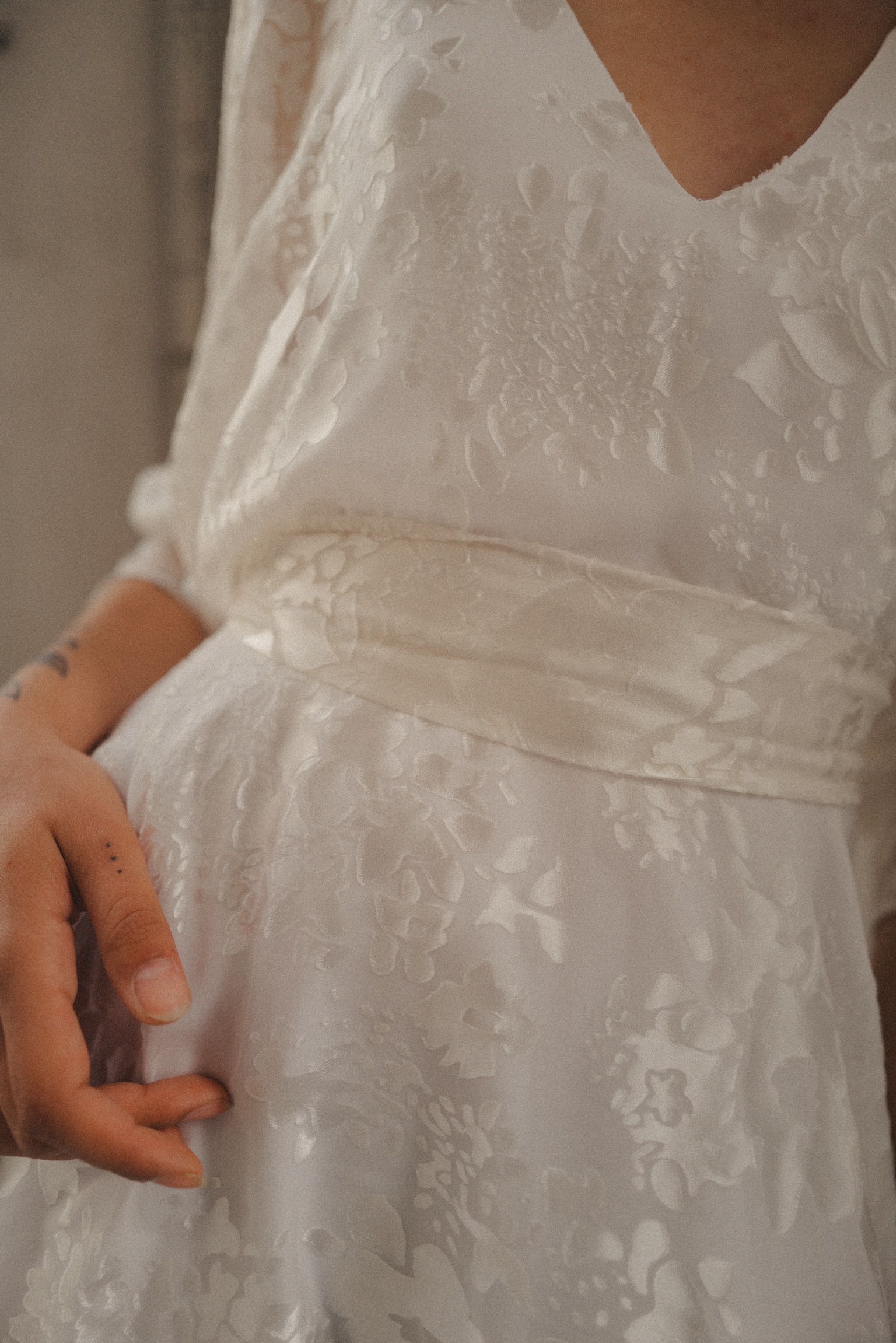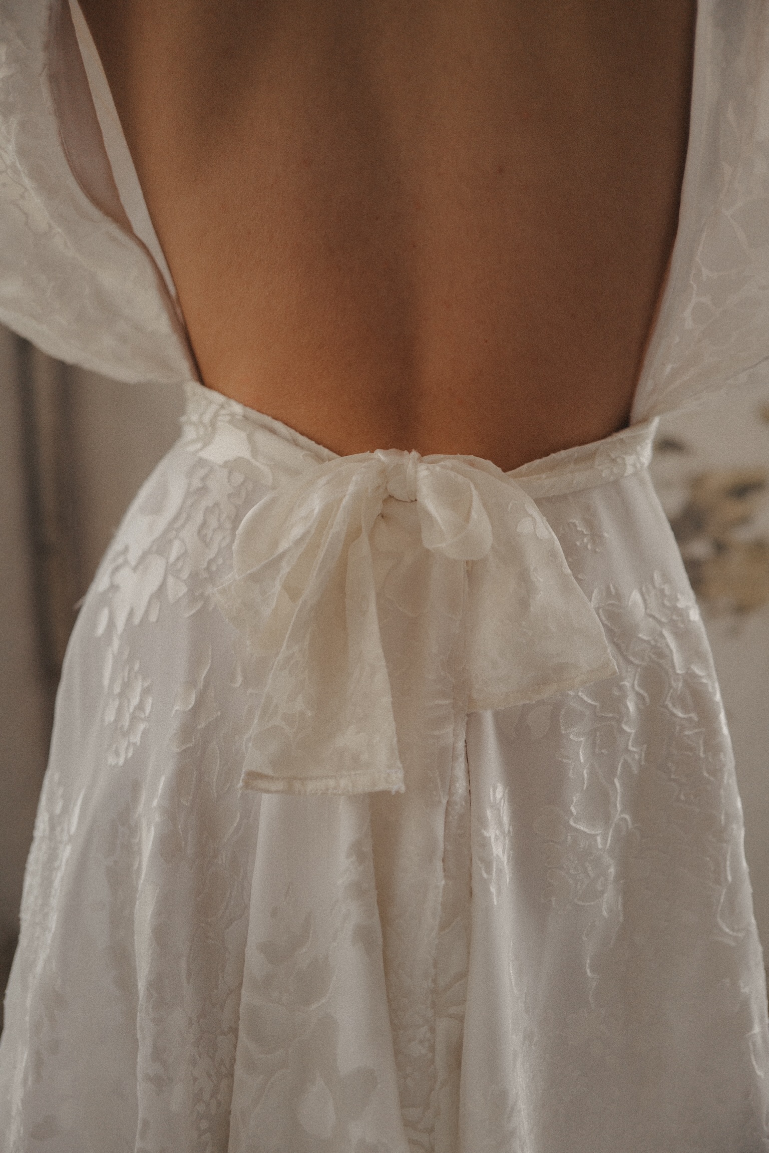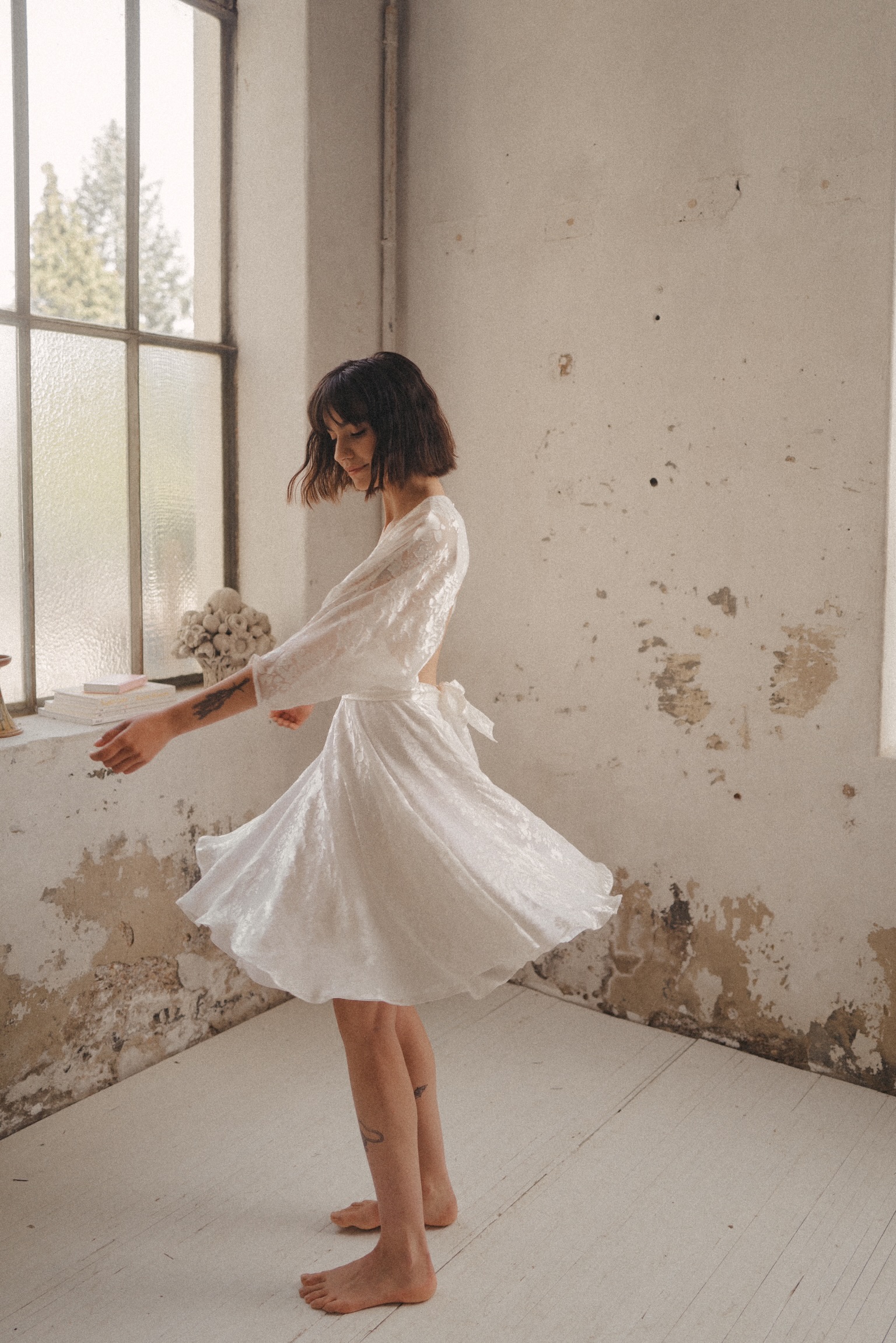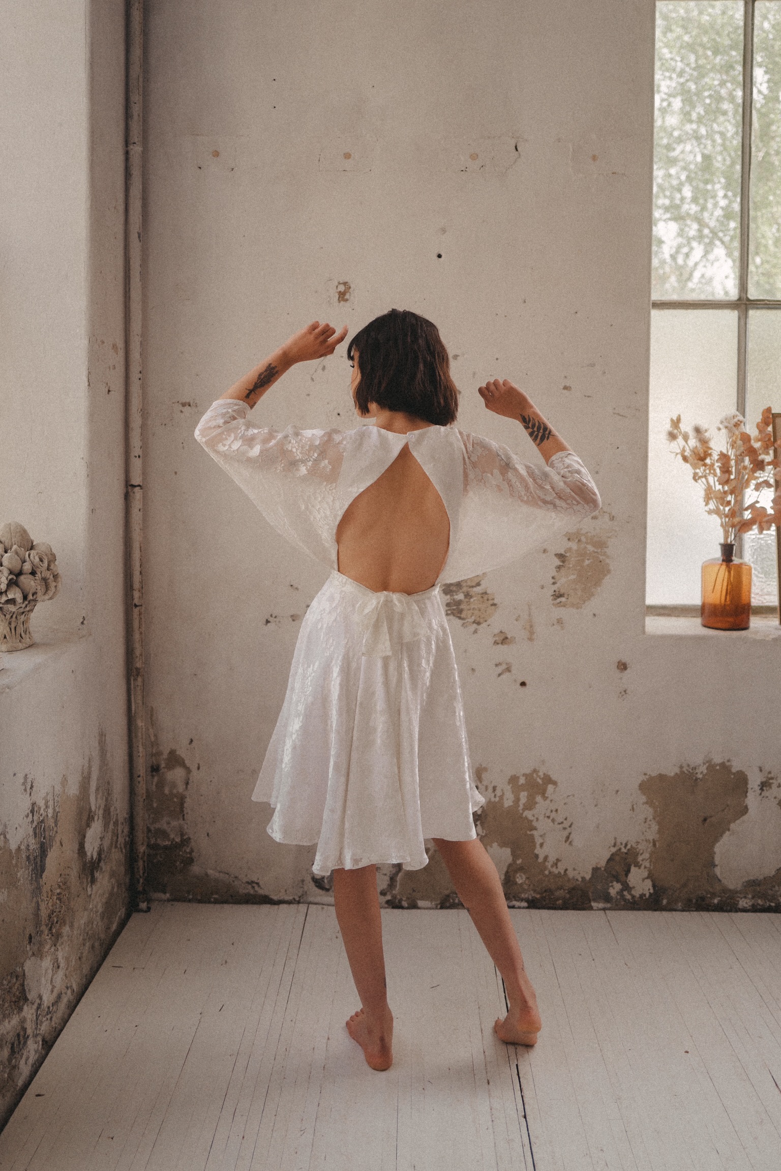 NISAEA Nisaea est une robe courte patineuse avec des manches kimono, réalisée en satin dévoré et crêpe de soie doublée viscose. Prendre rendez-vous