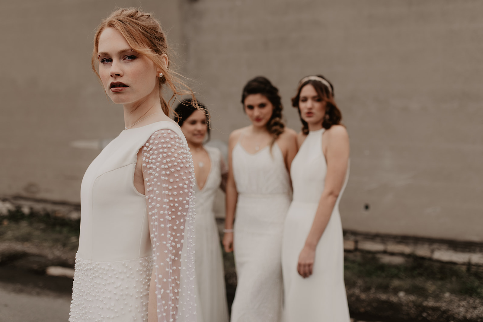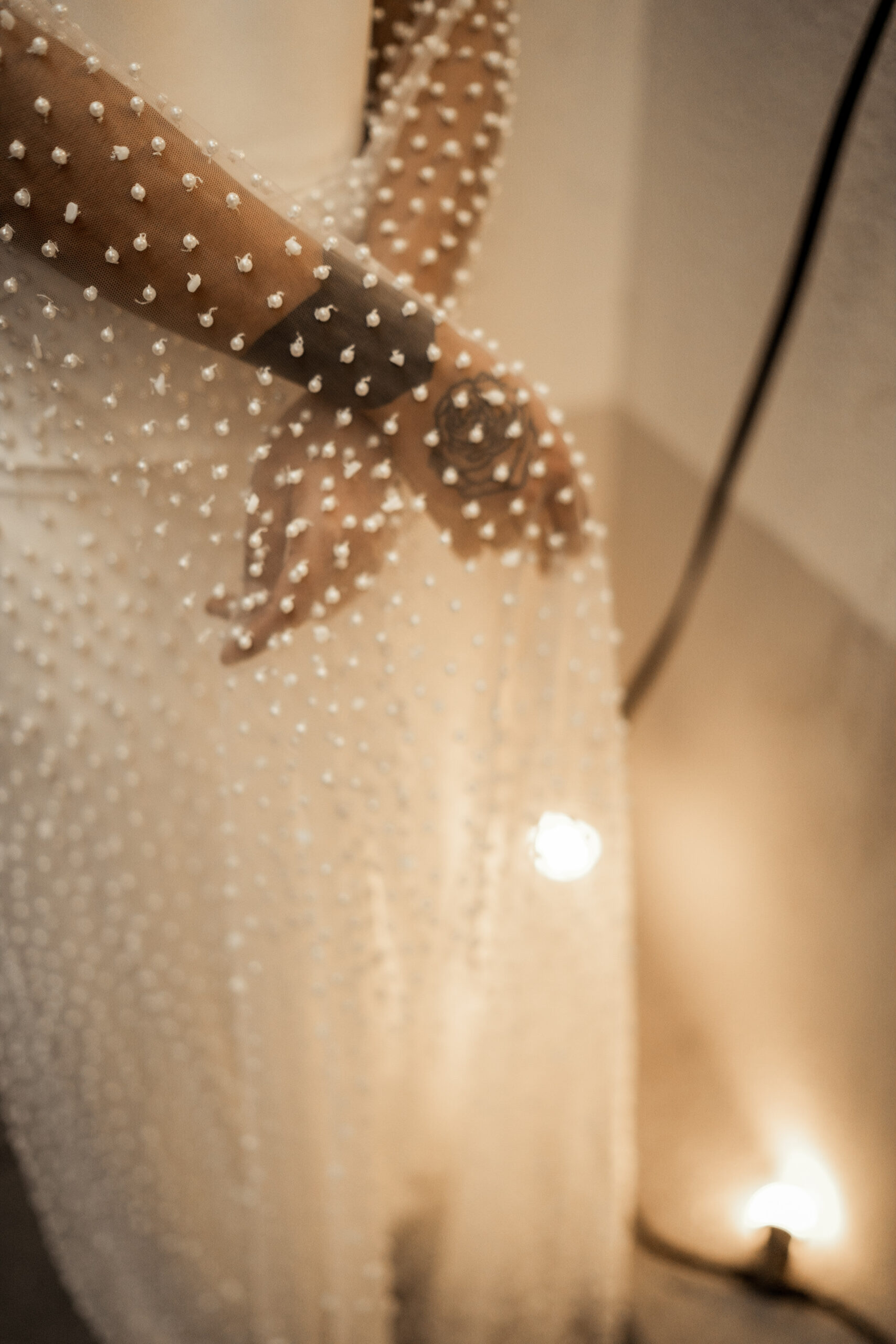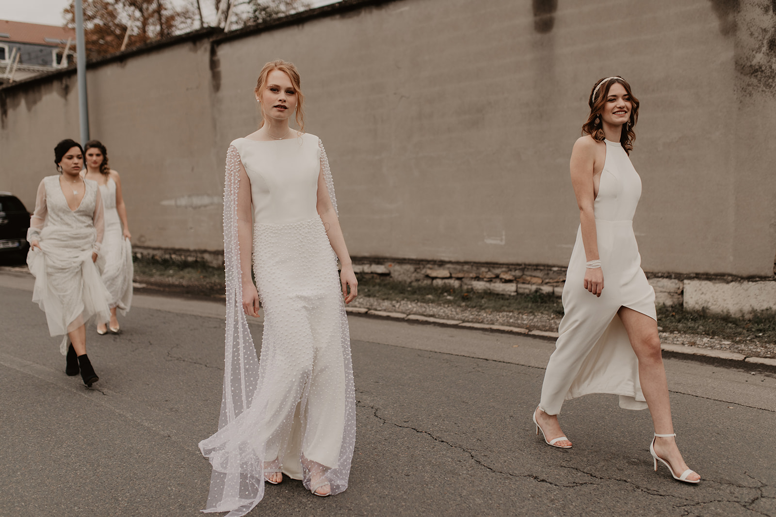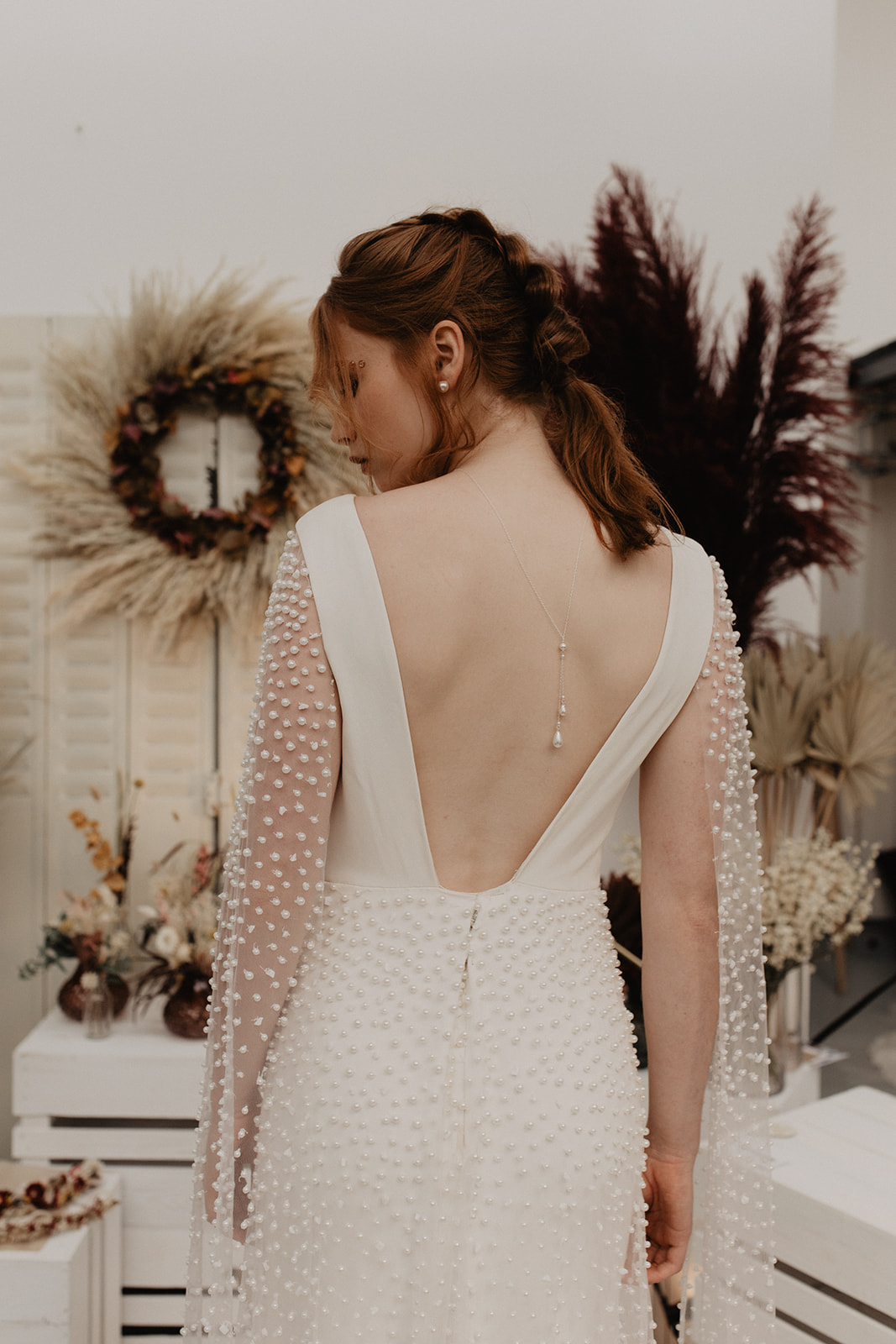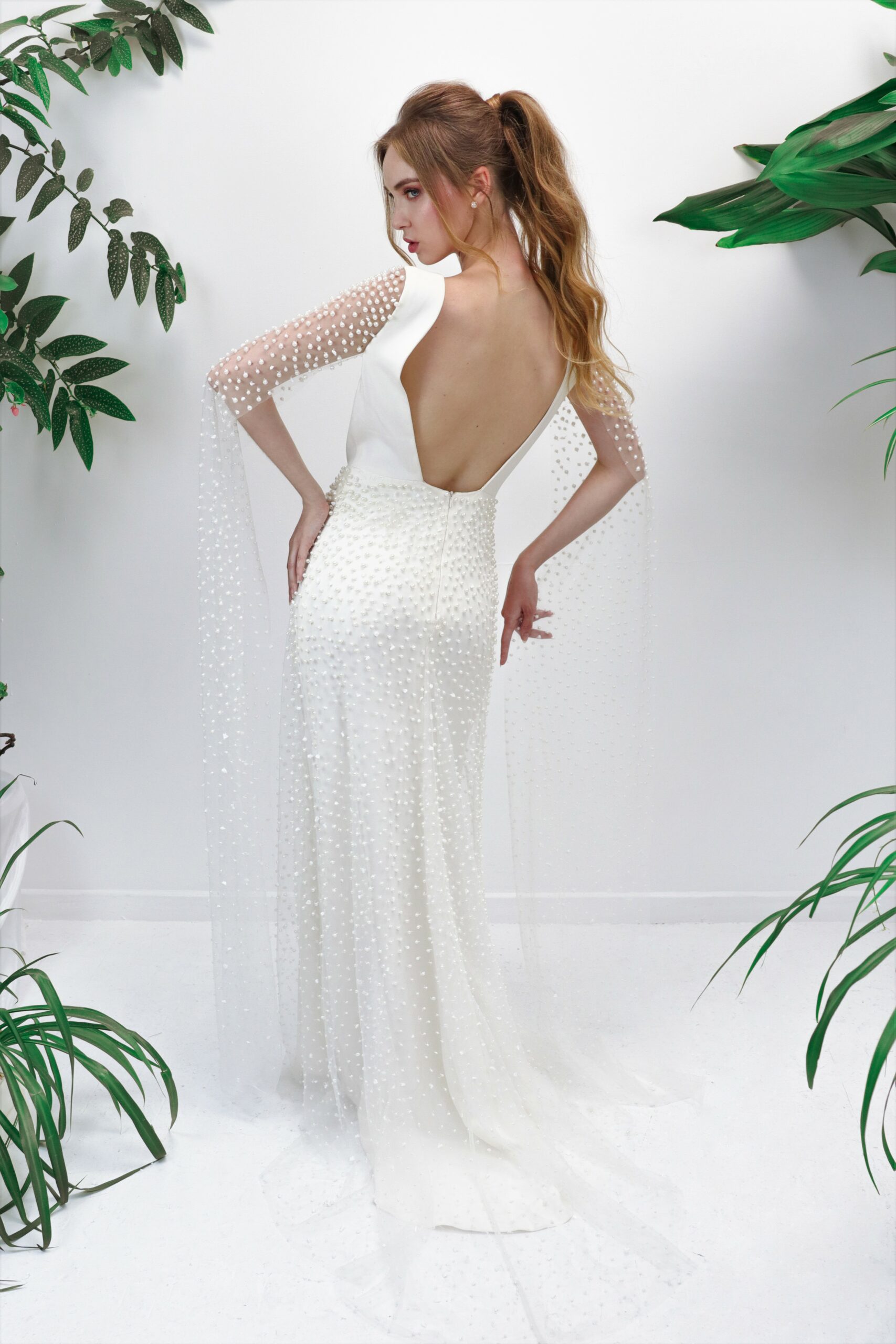 ZOE Zoé c'est la sobriété avec une touche d'excentricité grâce aux manches capes et à la sur-jupe en tulle brodé de perles et petites pierres. Confectionnée en crêpe de soie touché "peau de pêche". Un modèle emplie d'élégance ! Prendre rendez-vous